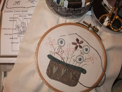 This is my first block, applique finished and stitching started.